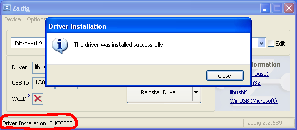 | Step 8. | If you see a message indicating successful install you are done with the driver install. |